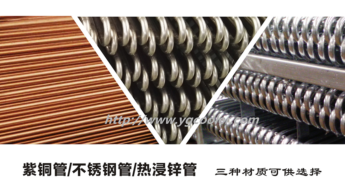 冷却器换热盘管有紫铜管、不锈钢管和热浸锌管三种材质可供选择。盘管制作过程中经过三次压力不小于1.5Mpa的严格气密性测试。换热盘管组采用蛇形管设计,沿水流方向适度倾斜,以利于盘管放水排空。